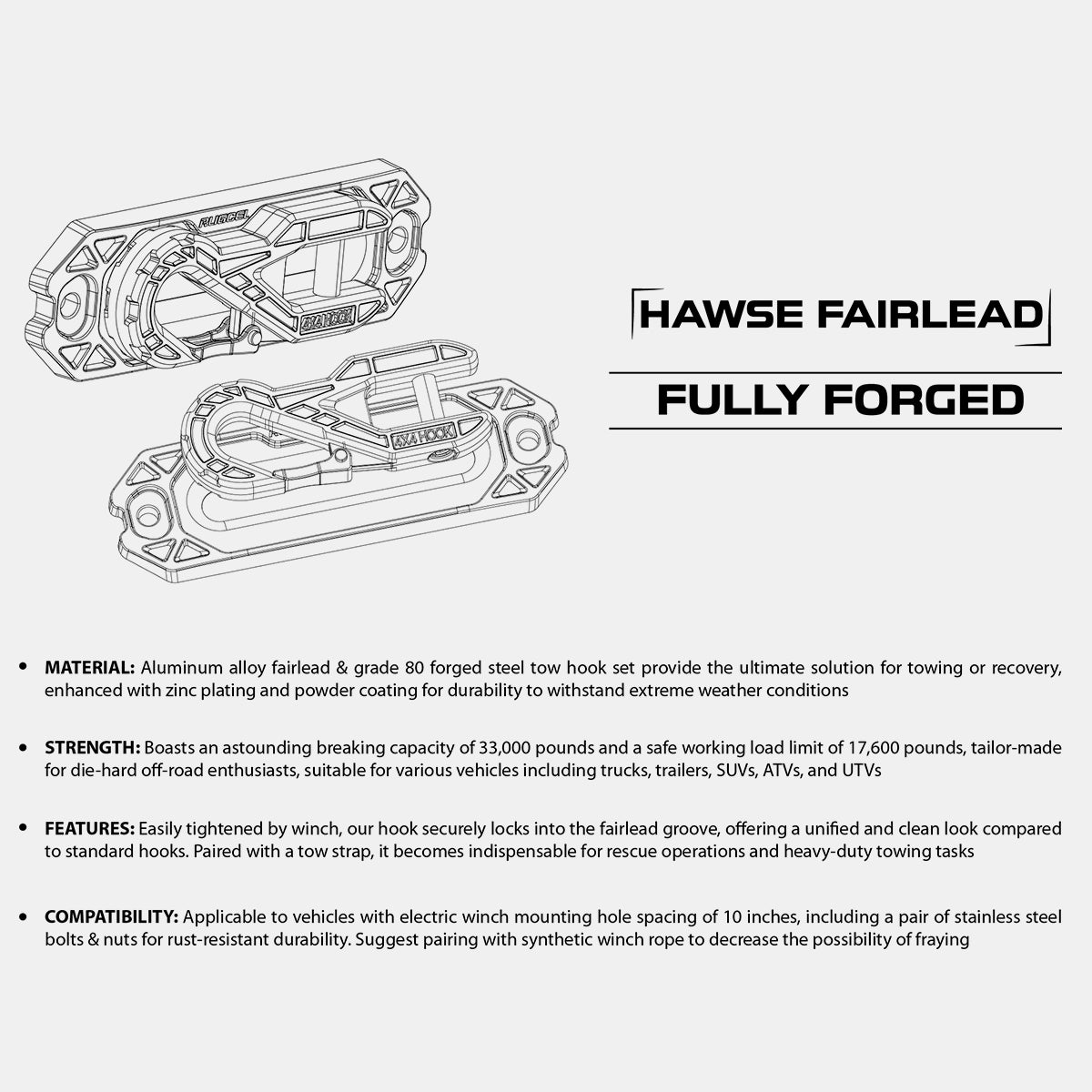- MATERIAL: Aluminum alloy fairlead & grade 80 forged steel tow hook set provide the ultimate solution for towing or recovery, enhanced with zinc plating and powder coating for durability to withstand extreme weather conditions
